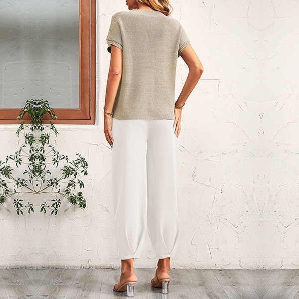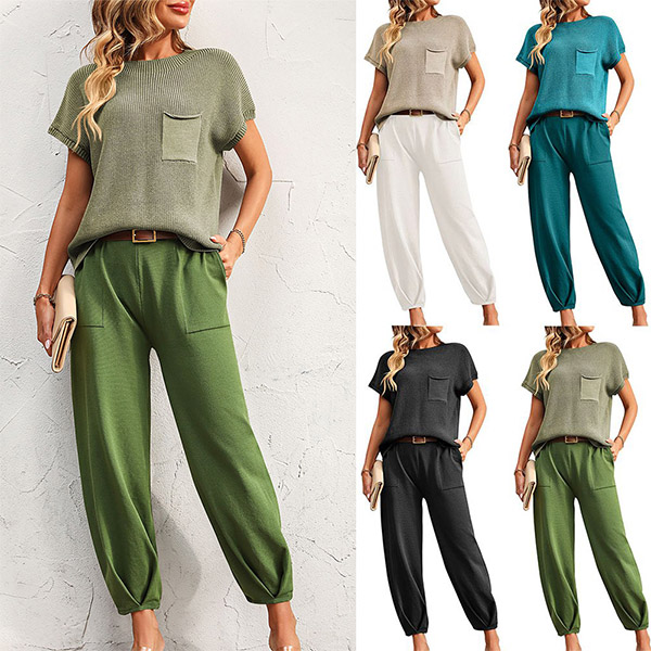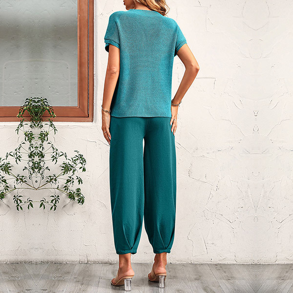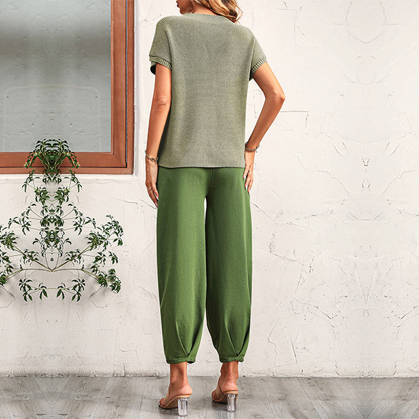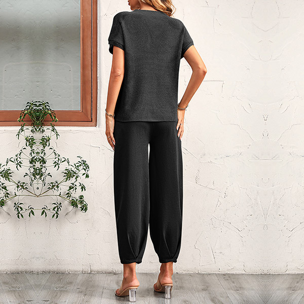 This two-piece set consists of a knitted shirt and pants. The knitted texture adds a cozy and relaxed vibe to the overall design. Whether you're going for a casual day out or just lounging at home, it is the perfect choice.
