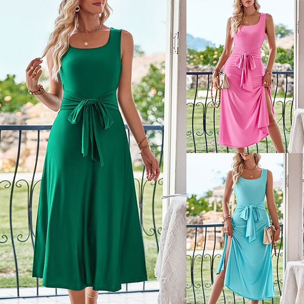 This fashion dress features a classic U-neckline, sleeveless design, and a self-tie waist detail for a chic and casual look. Crafted with high-quality fabric, this dress offers both comfort and style.