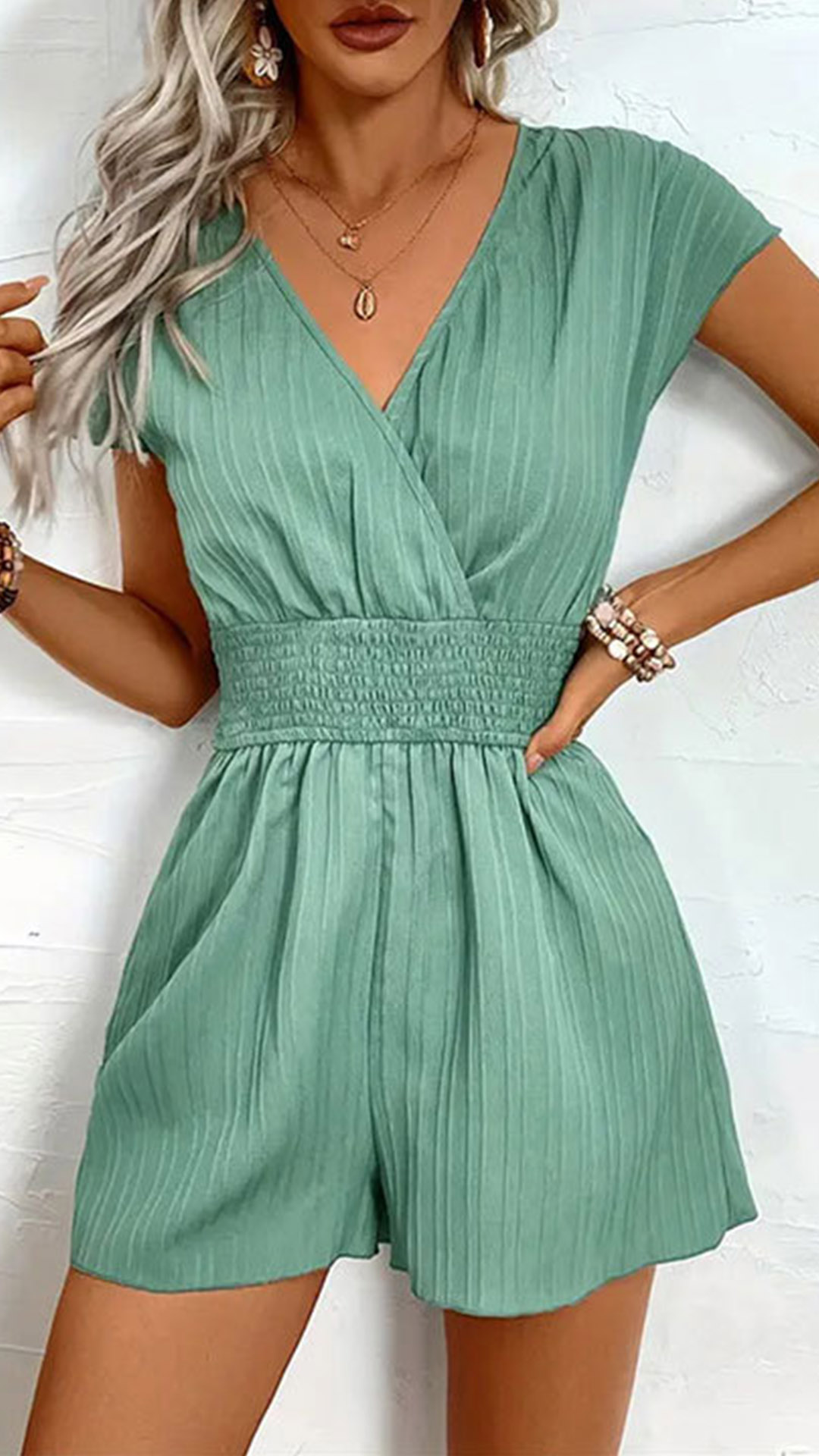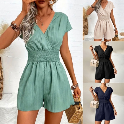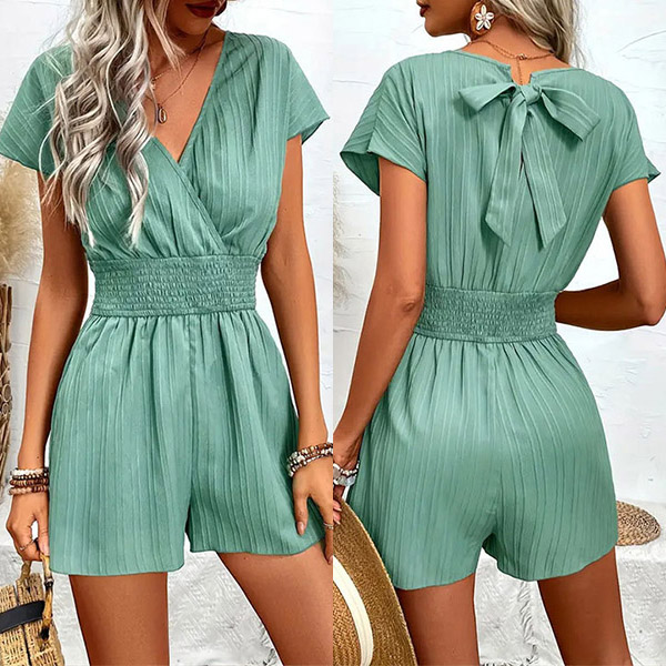 This stylish romper features a v-neck neckline, short sleeve, smocked waist, and back bowknot design for a sweet look. It is perfect for relaxed, everyday wear.
