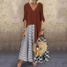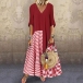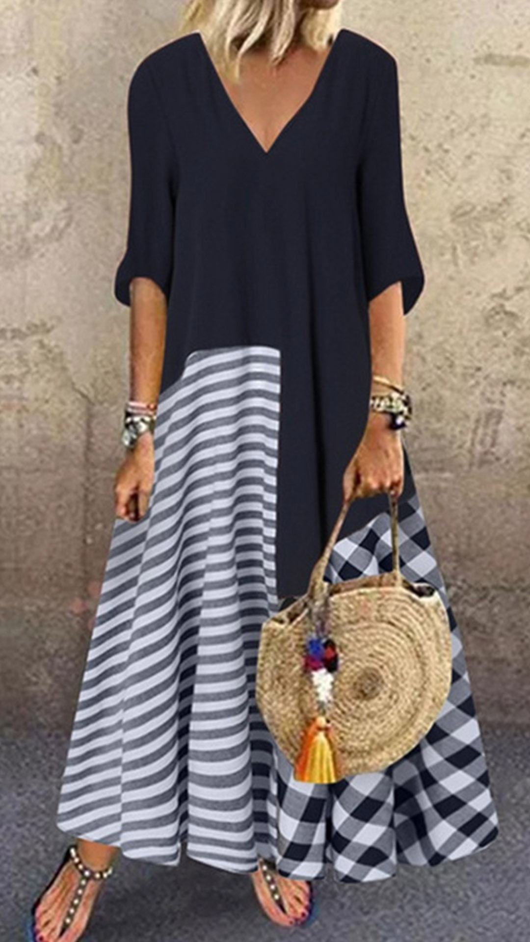 Casual V-neck Elbow Sleeve Contrast Color Plaid Stripe Printed Maxi Dress
