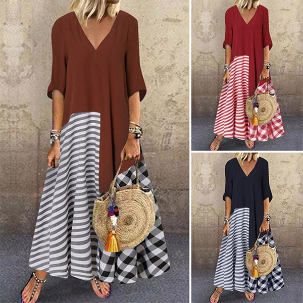 Looking for a casual yet stylish dress? This maxi dress is perfect for a day out! The elbow sleeves and V-neck design is for a casual look. I like the plaid pattern and the stripe pattern, which add a touch of style, while the relaxed fit keeps you comfortable all day long.