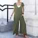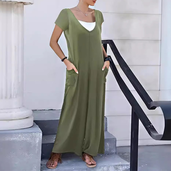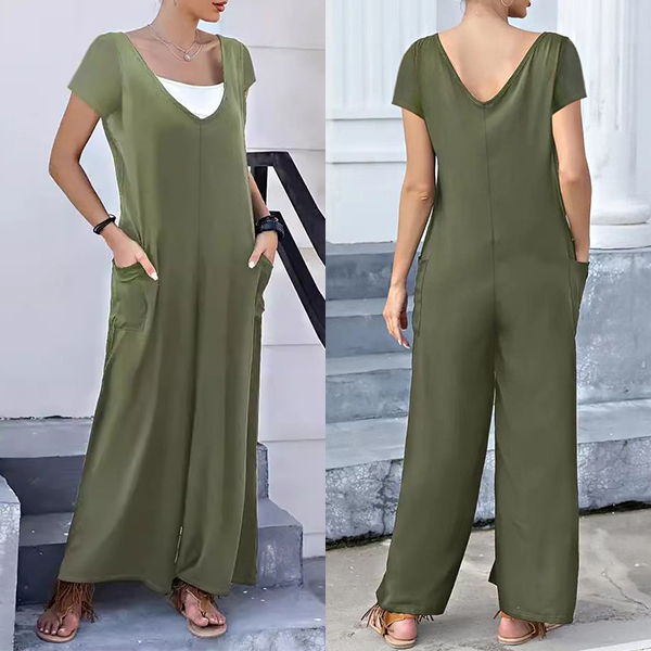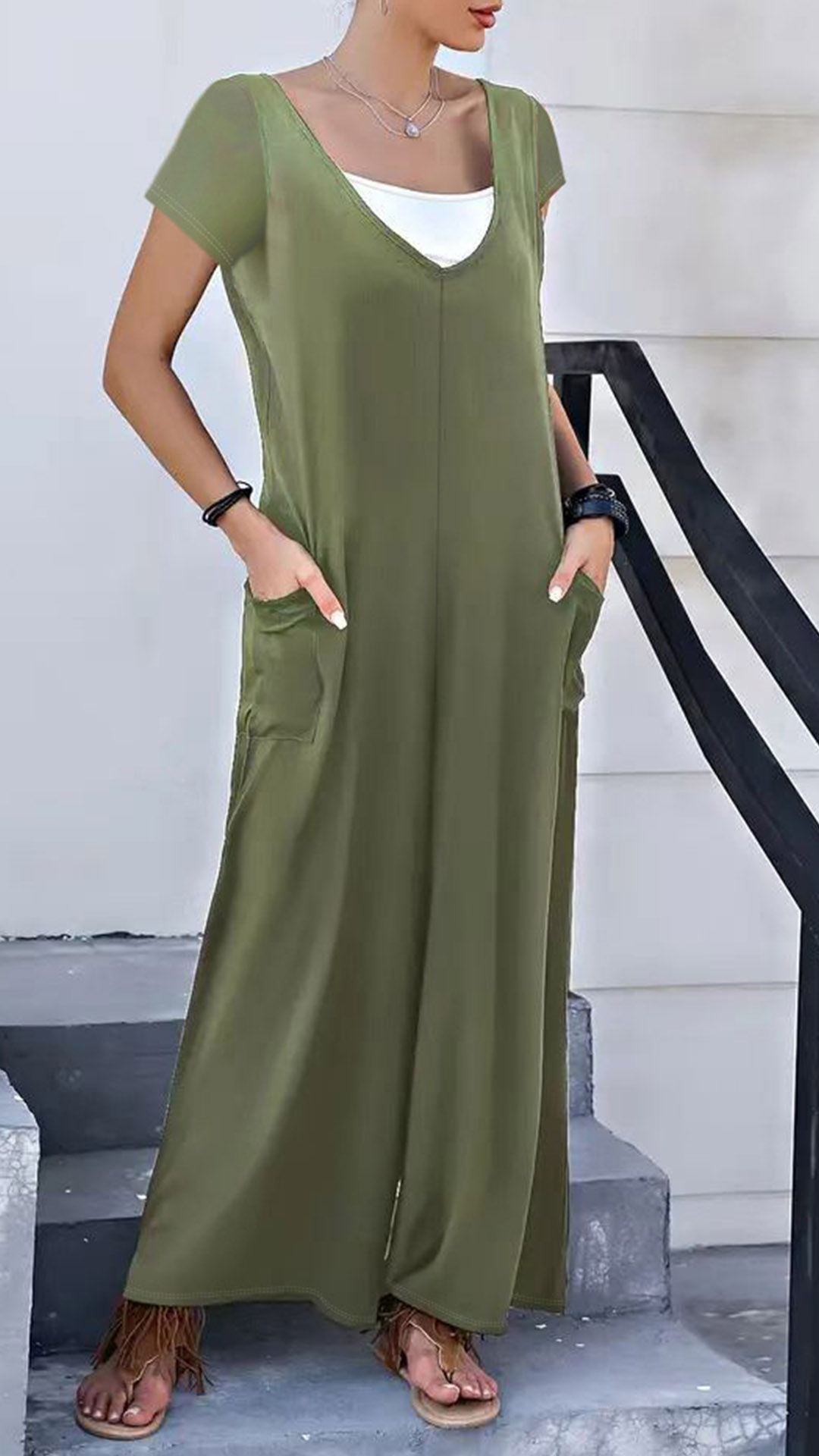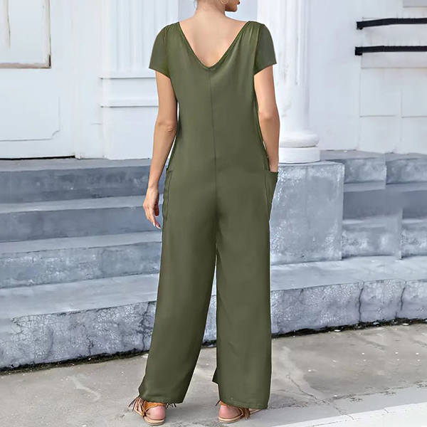 Casual V-neck Short Sleeve V-Neck Side Patch Pockets Straight-cut Loose Jumpsuit