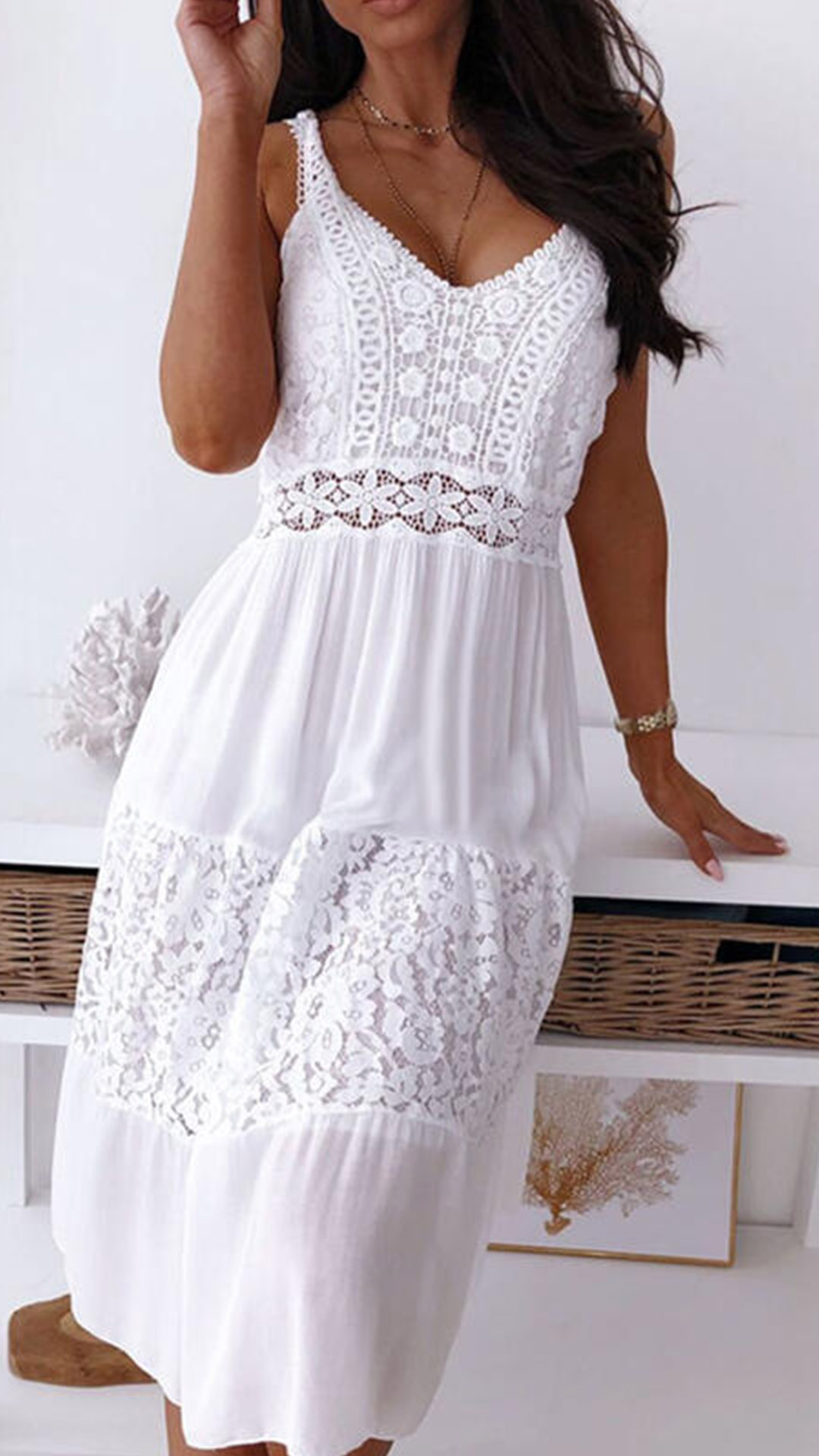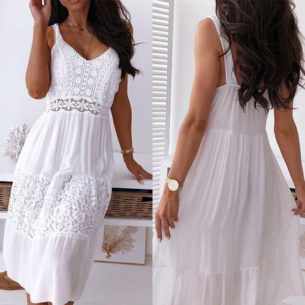 This beautiful and delicate lace dress is perfect for a summer day out! The V-neckline and sleeveless silhouette are flattering and feminine, while the tiered skirt adds a touch of fun and playfulness. The white hue is perfect for keeping cool and feeling fresh in the summer heat.