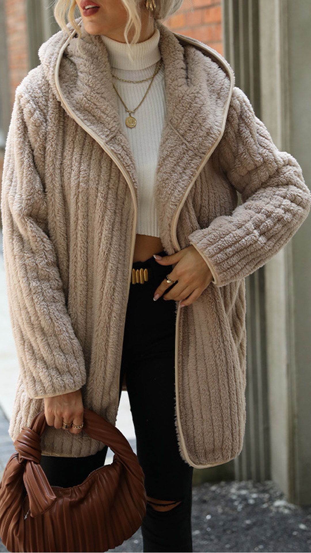 Made from a soft and plush fabric, this cardigan is sure to keep you warm all season long. The vertical stripes add a slimming effect, while the hood and pockets add a touch of practicality. Pair it with your favorite jeans and boots for a casual and chic look.