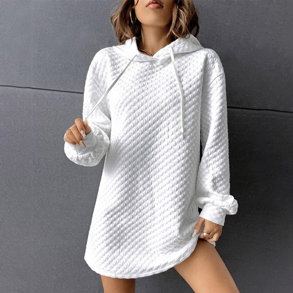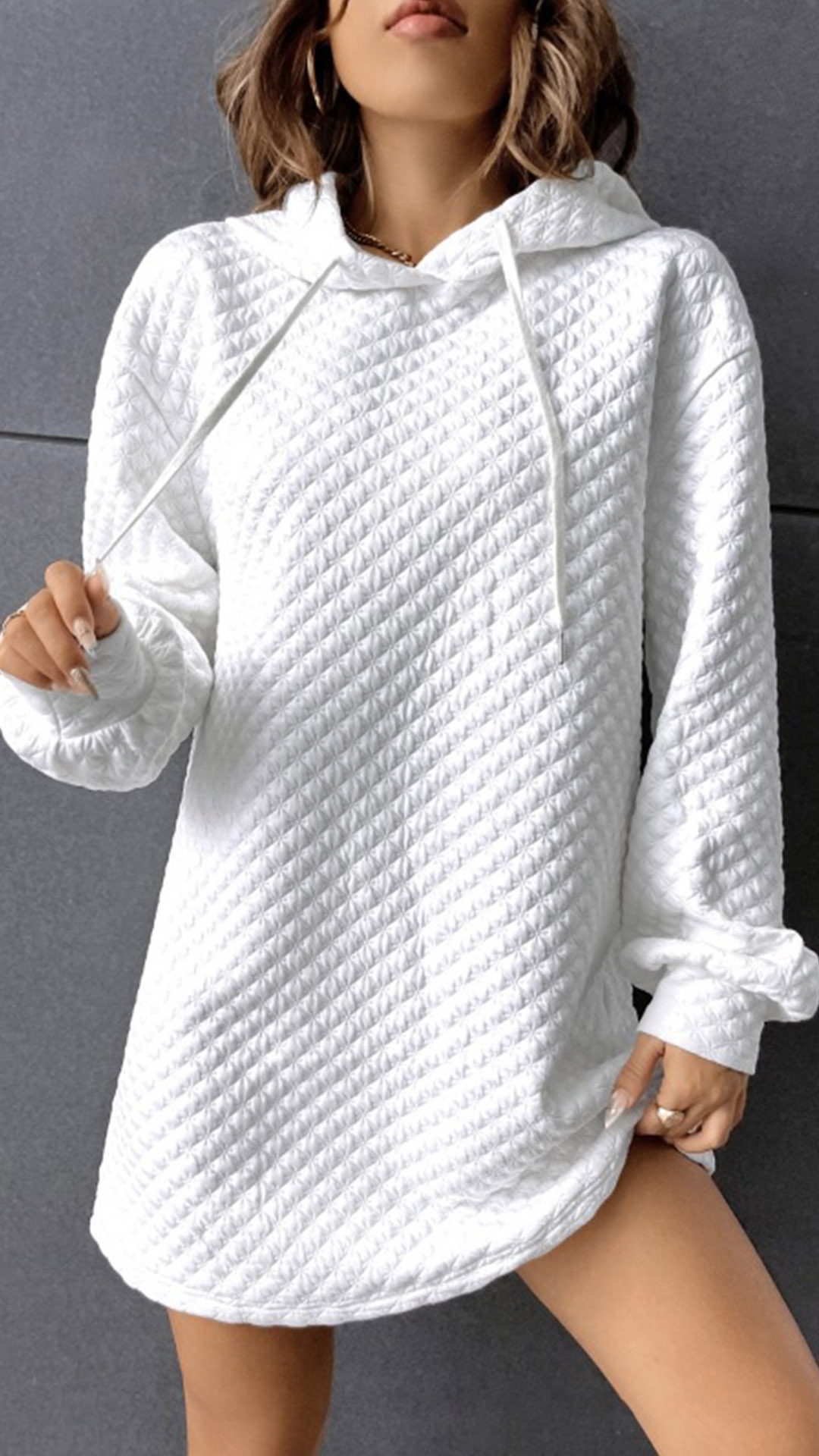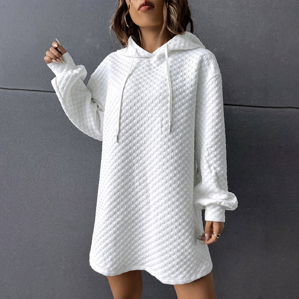 Casual Waffle Pattern Drawstring Hooded Long Sleeve Mini Dress