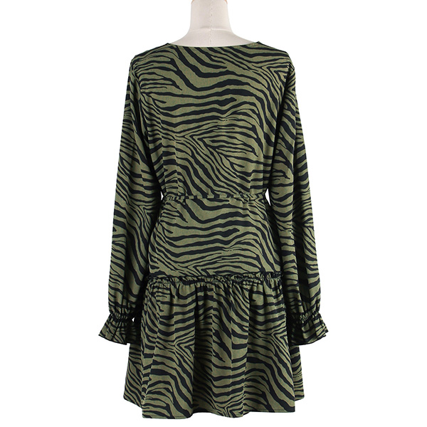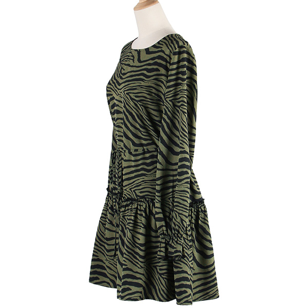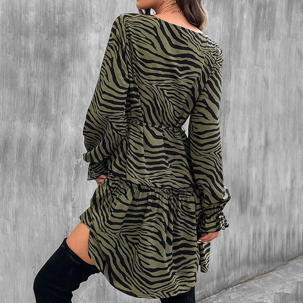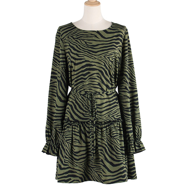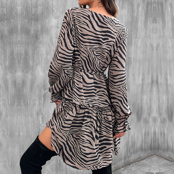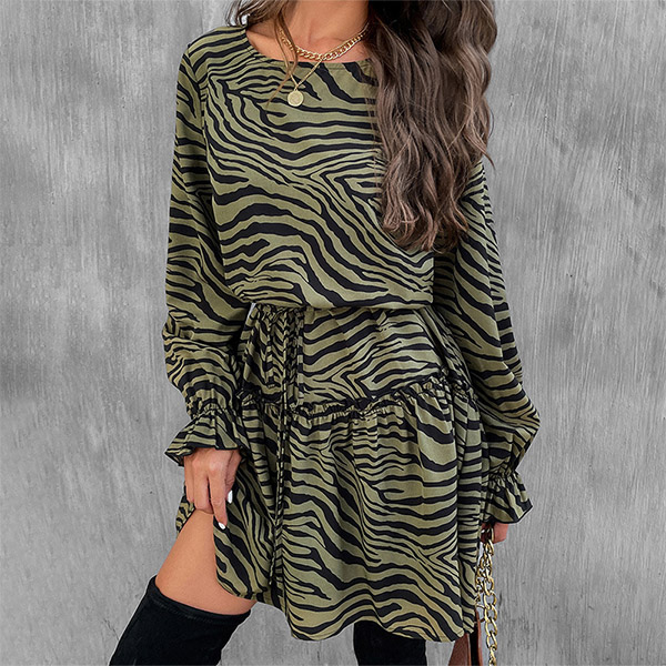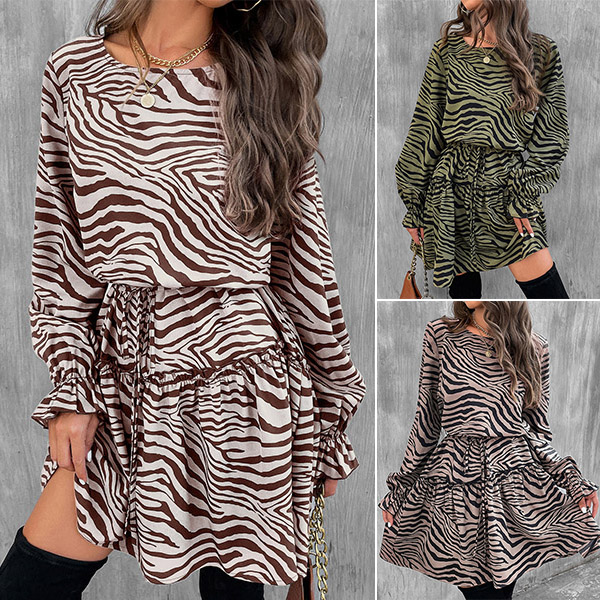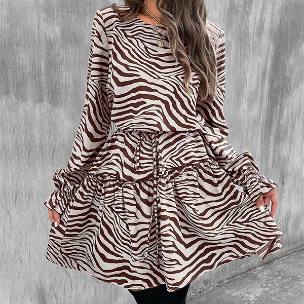 Casual Zebra Printed Round Neck Long Sleeve Self-tie Dress
