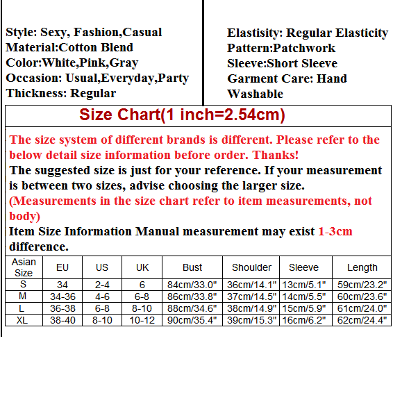 XL : Bust : 90cm(35.43"); Shoulder : 39cm(15.35"); Sleeve : 16cm(6.3"); Length : 62cm(24.41");