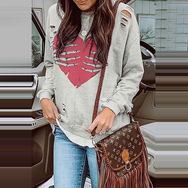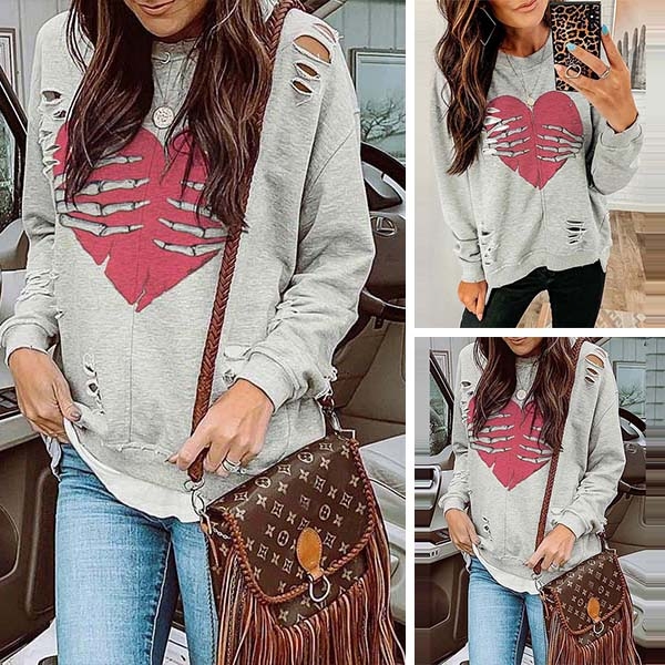 with long sleeve and round neck design,which can offer you a comfortable day. The heart pattern and ripped