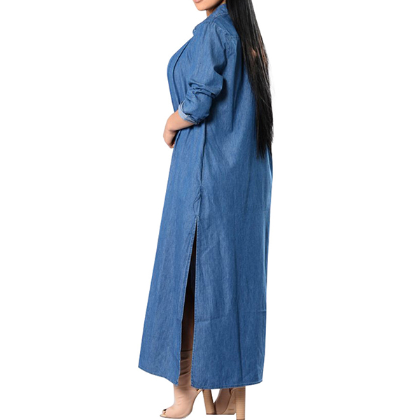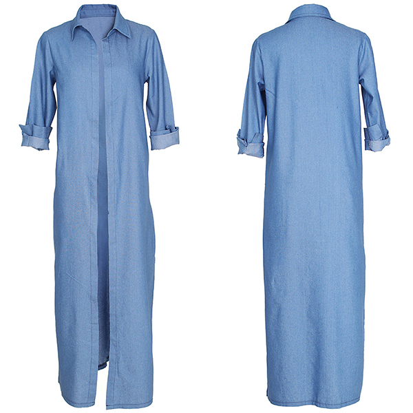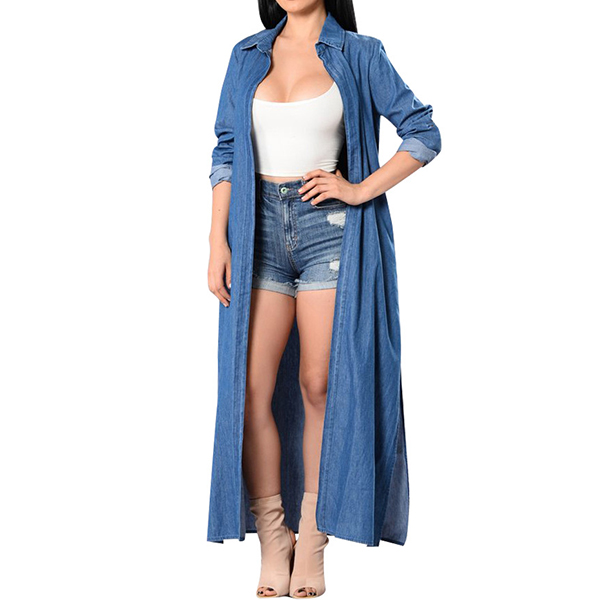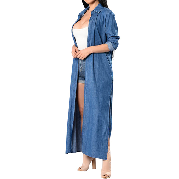 Easy to achieve for a chic style with this denim cardigan. Designed with long sleeve,POLO collar,slit hem and a maxi length,