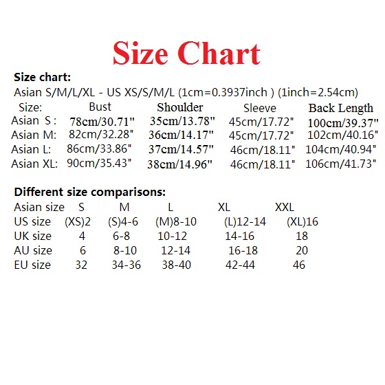 XL : Bust : 90cm(35.43"); Shoulder : 38cm(14.96"); Sleeve : 46cm(18.11"); Back Length : 106cm(41.73");