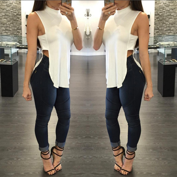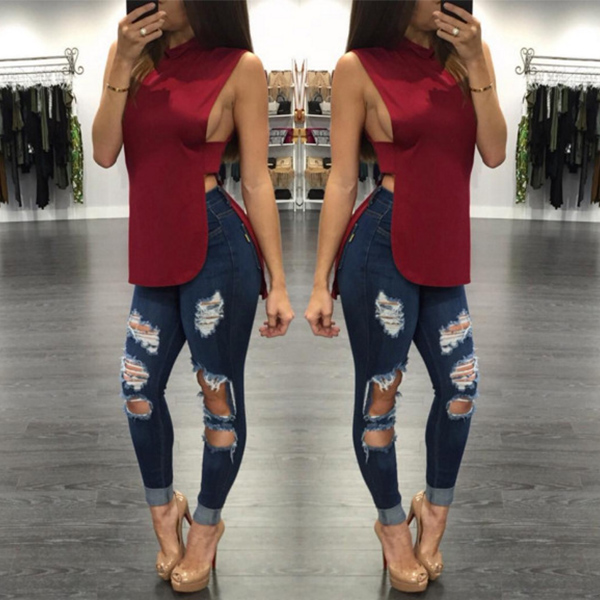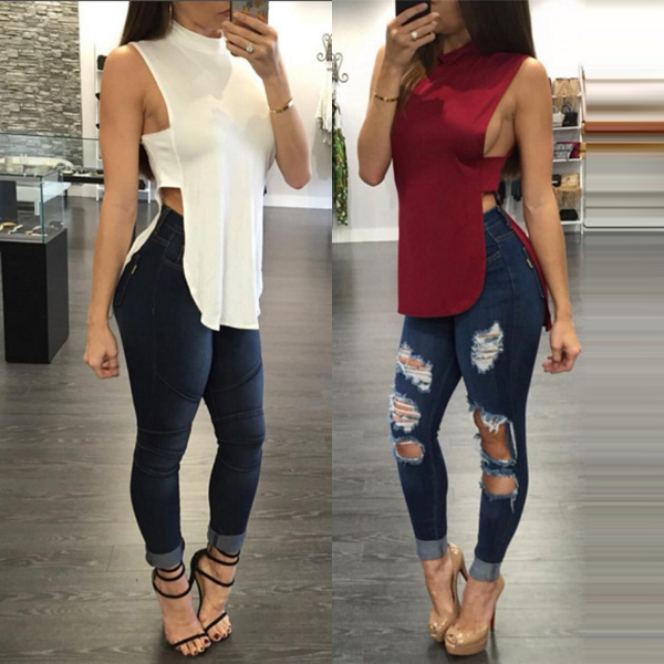 Solid color style,designed with sleeveless,mock neck and slit hem,this t-shirt is a perfect combination of chic and sexy elements.