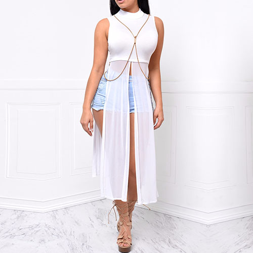 Wow,have you ever seen such a chic and unique top? Its classic and distinctive details such as sleeveless,round neckline and gauze spliced hem make