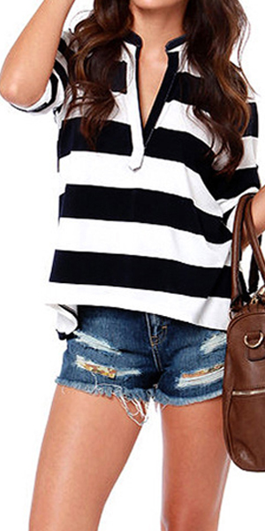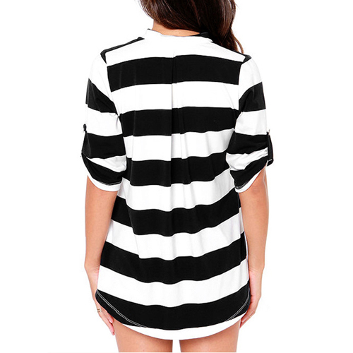 It features strip print, mock neckline and 1/2 sleeves. Good choice for weekend and casual time.