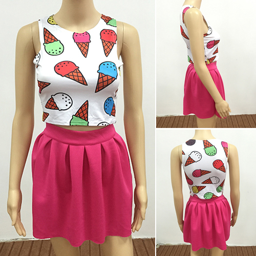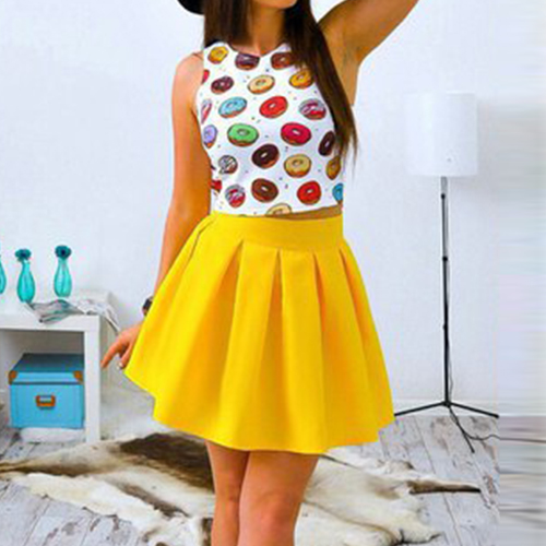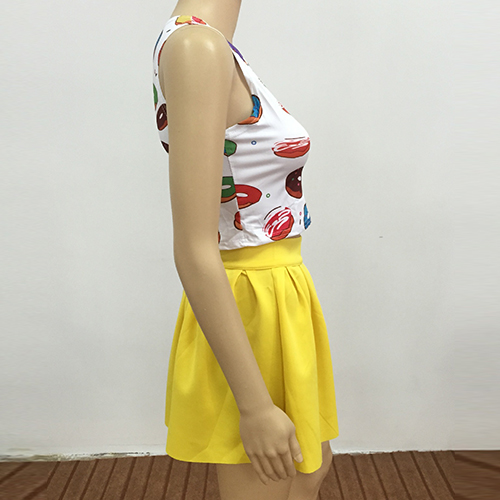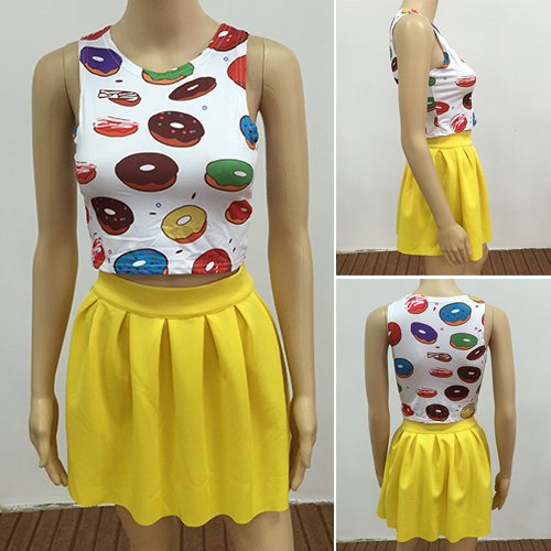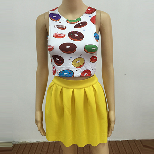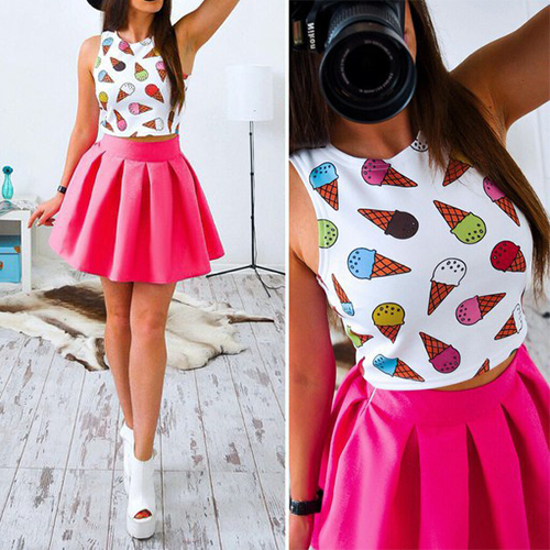Short of time for wardrobe matching? Then we suggest you choosing this two-piece set. Including a cartoon printed sleeveless round