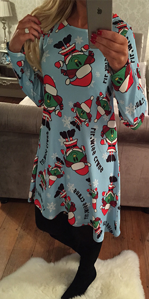 Infuse some happy and cute vibe into your Christmas Eve with this dress. It boasts Santa, snowman and