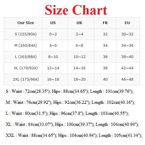 XL : Waist : 84cm(33.07"); Hips : 100cm(39.37"); Length : 104cm(40.94");
