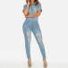 ripped details,retro yet stylish. When you slip into this denim jumpsuit,your slender figure and fashionable style will bloom