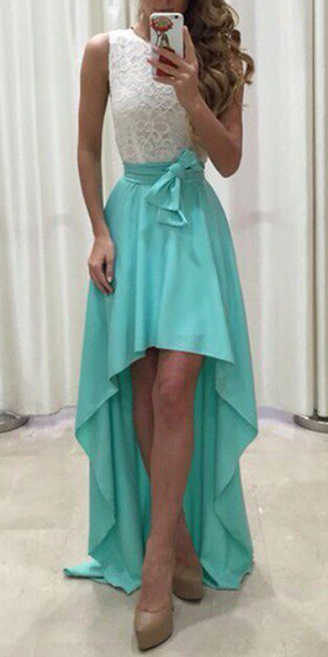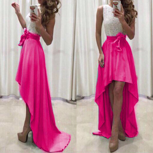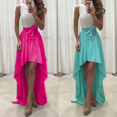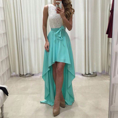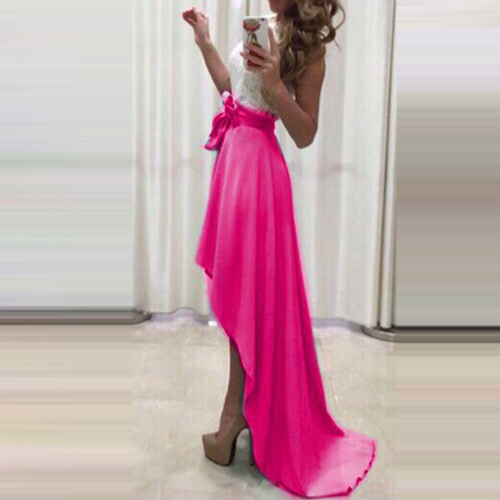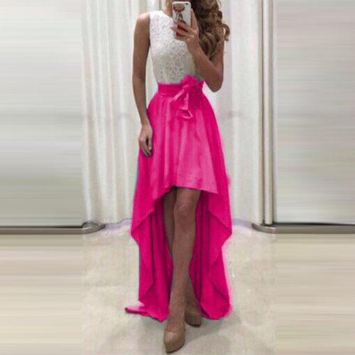 Establish a stunning presence with this dress set. Includes a round neck sleeveless lace tops and a solid color high-low dress,