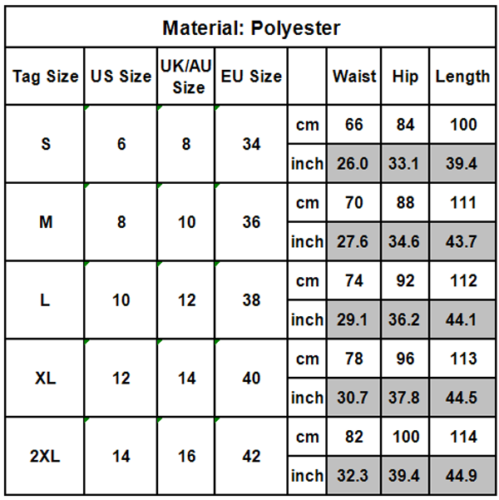 XXL : Waist : 82cm(32.28"); Hips : 100cm(39.37"); Length : 114cm(44.88");