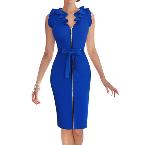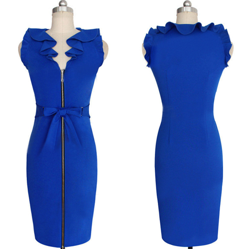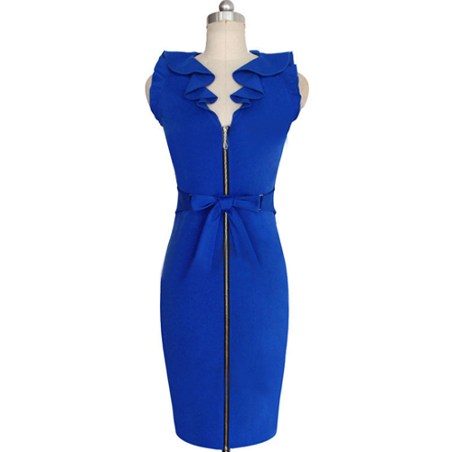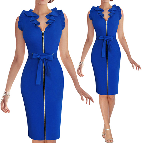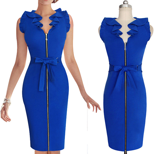 elegant and generous. Its refined designs like v-neckline with flouncing design,front zipper closure and slim fit design