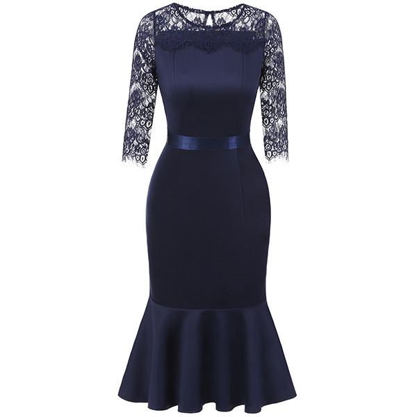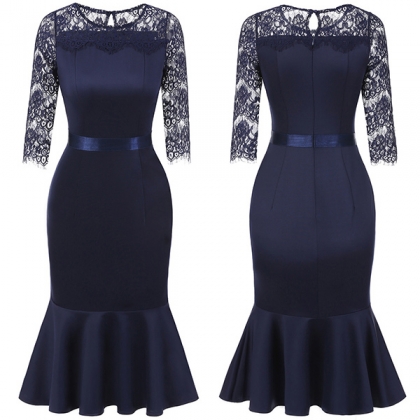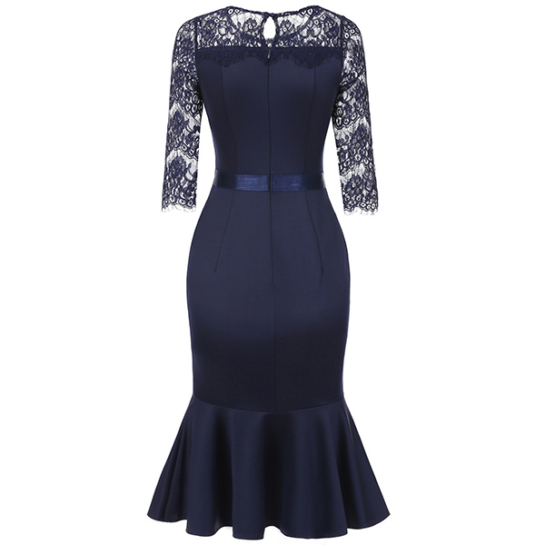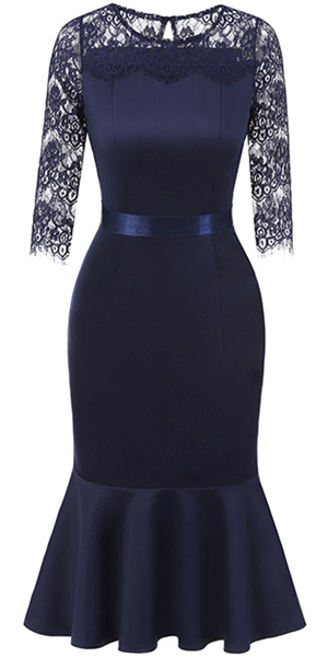 the lace spliced details and fishtail hem design make this dress look more stunning.