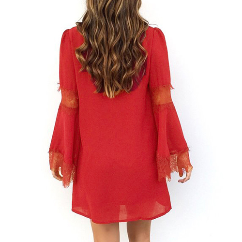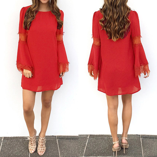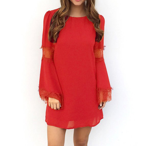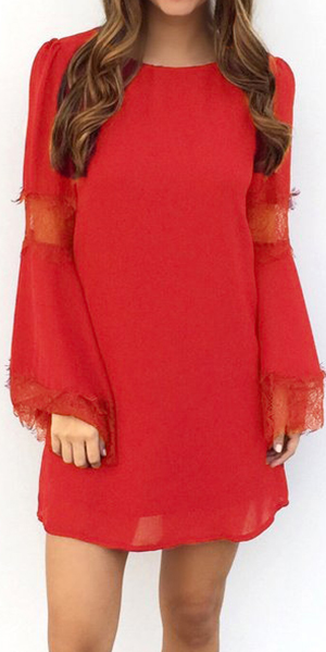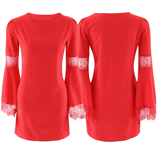 with lace spliced, round neck and bell sleeve design, which is aimed to give you an added feminine
