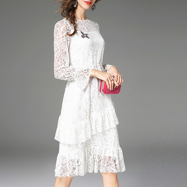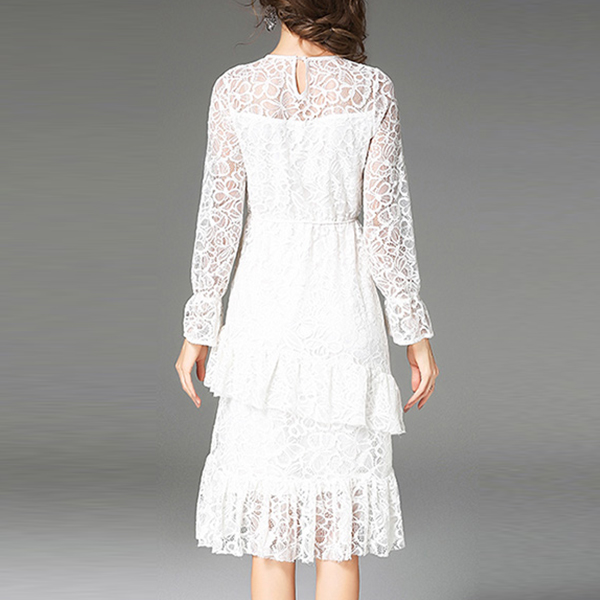 It is designed with a simple white tone,accompanied with long sleeve,round neck,high waist and ruffle hem,