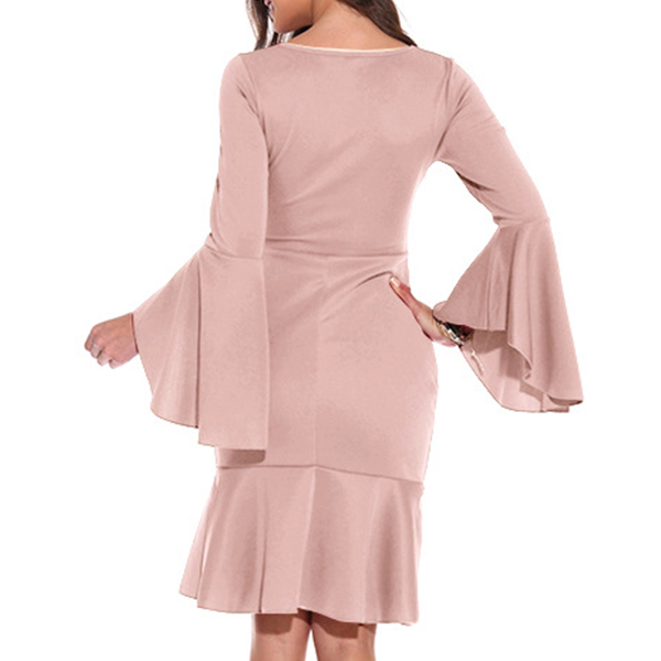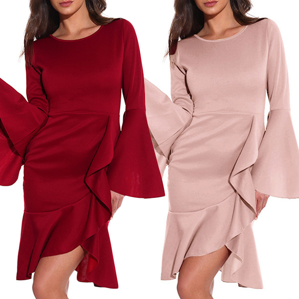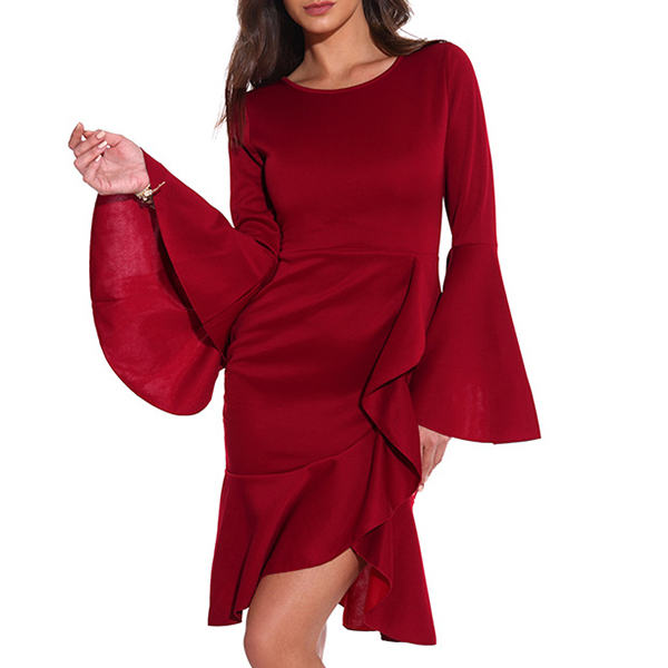 This dress features a classic yet flattering black tone,stylish and elegant. Outfitted with long sleeve,round neck,ruffle hem and a fit silhouette,this dress can portray your elegant image as well as showcase your perfect curve. For your dinner date or weekend gatherings,this delicate dress can be a good choice!