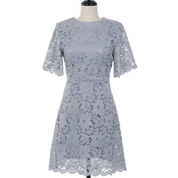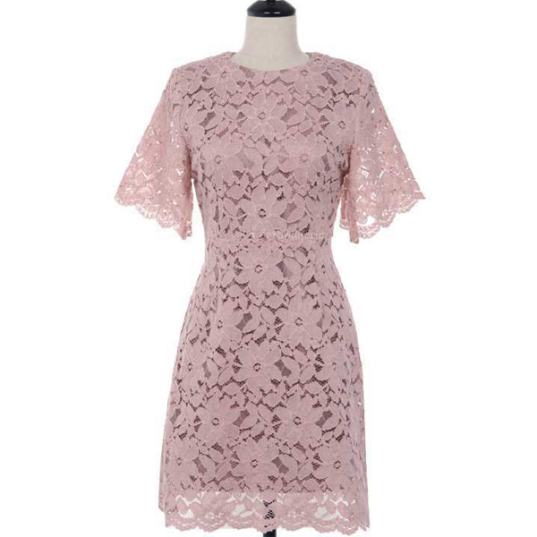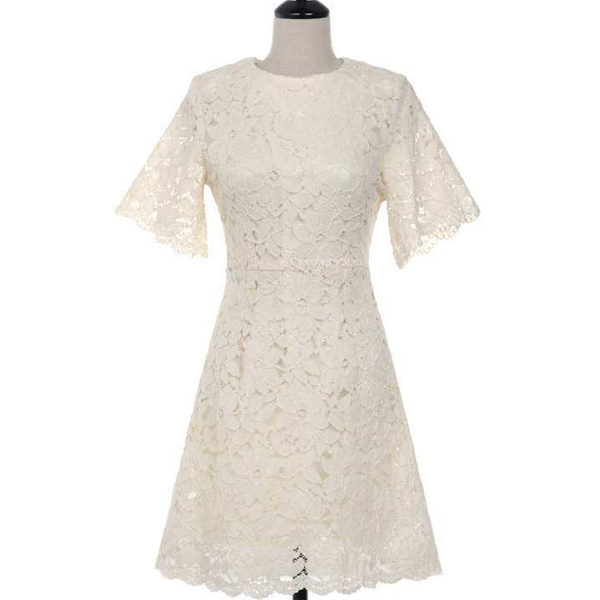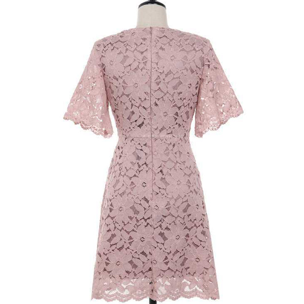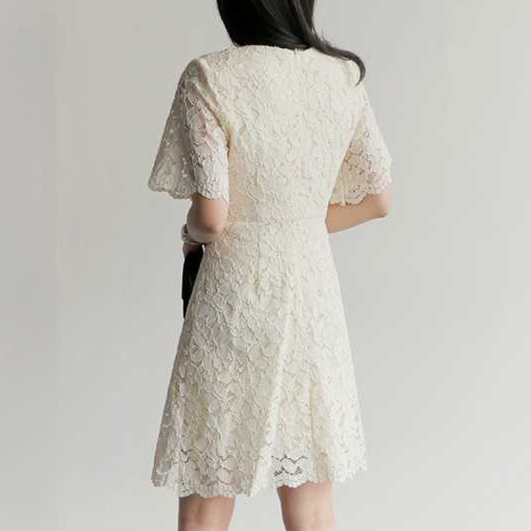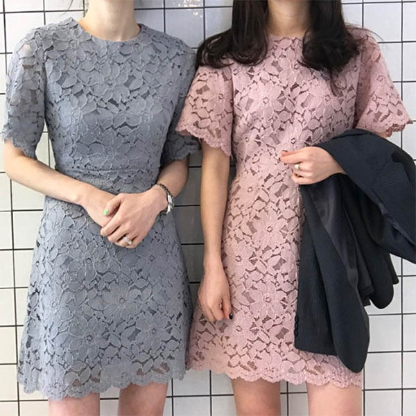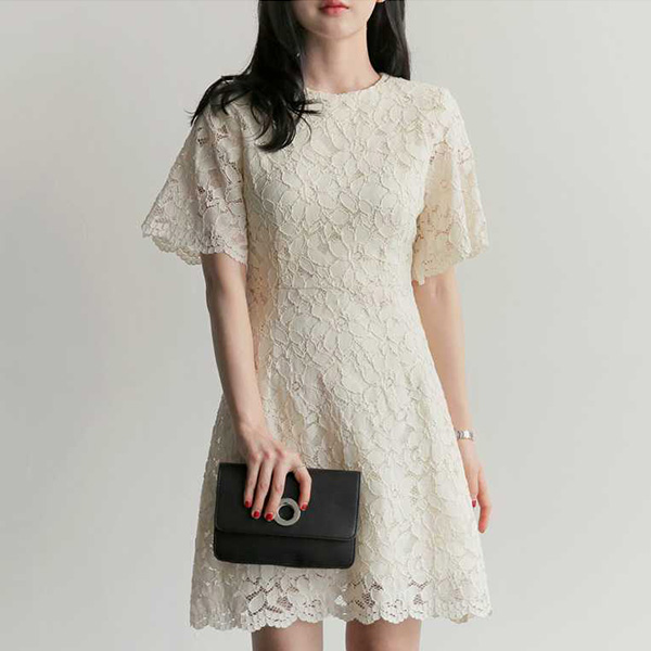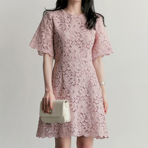a solid color,finished with short sleeve,round neck and a clean silhouette,this delicate lace dress can take