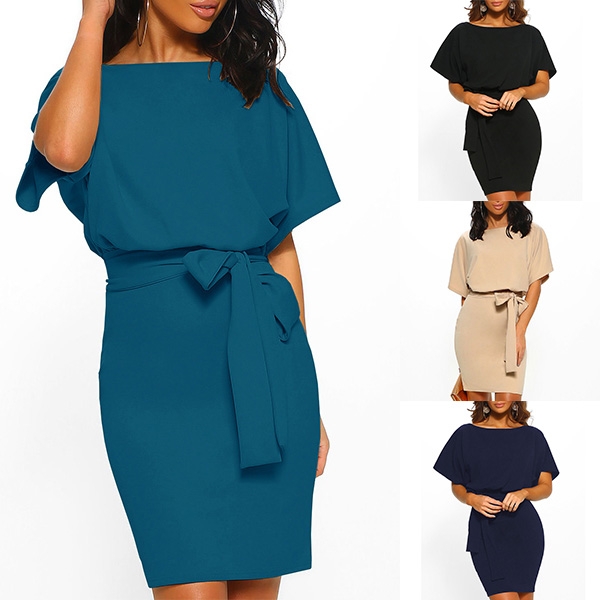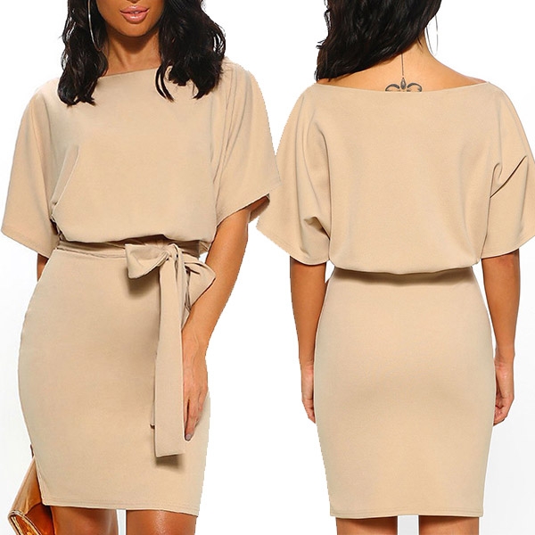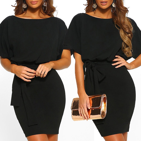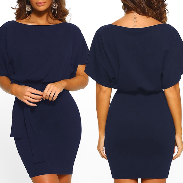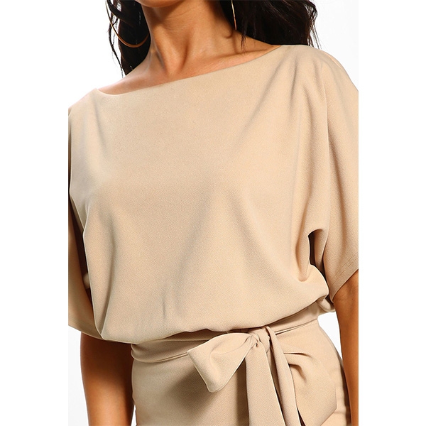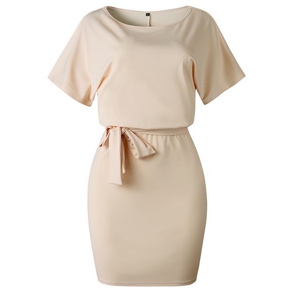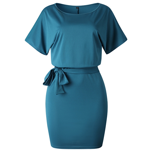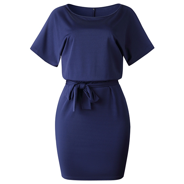 image. It boasts a solid color,with short sleeve and round neck design,the waist strap and fit silhouette