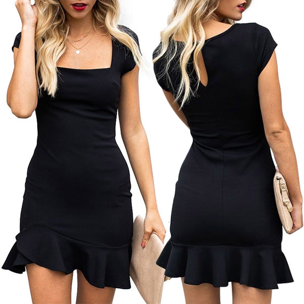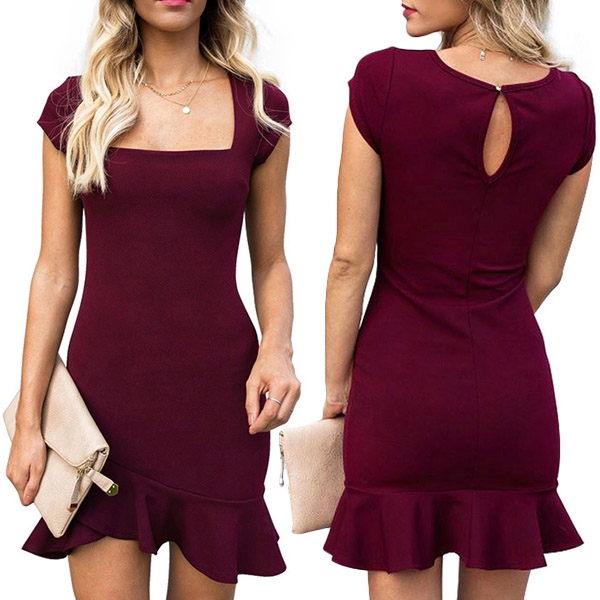 Elegant Solid Color Short Sleeve Square Collar Ruffle Hem Dress
