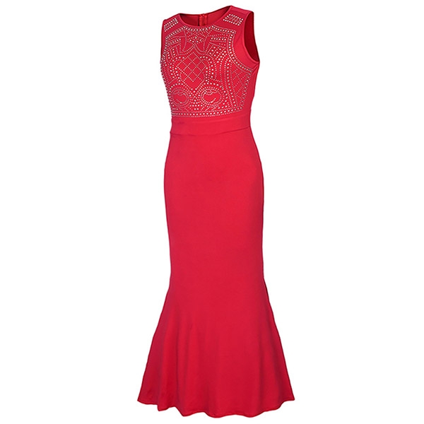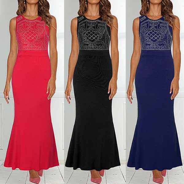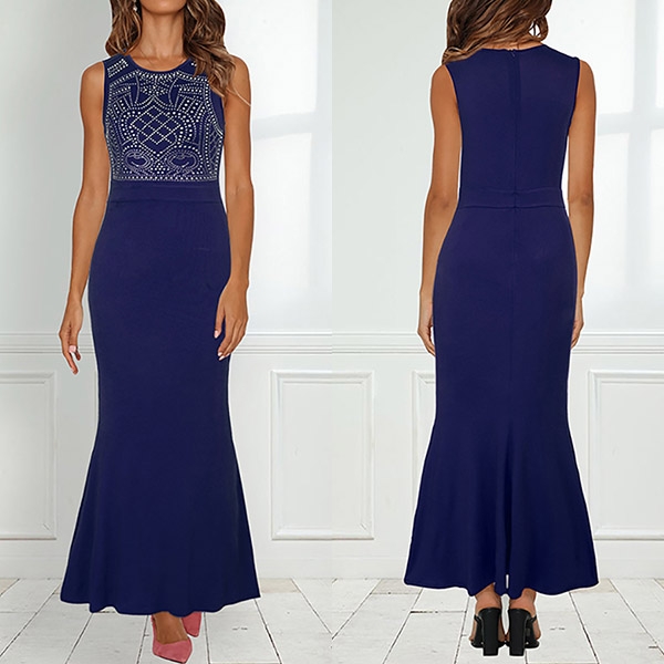 with sleeveless,round neck,high waist and a clean silhouette,this dress is sure to portray your elegant