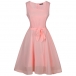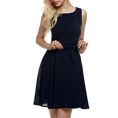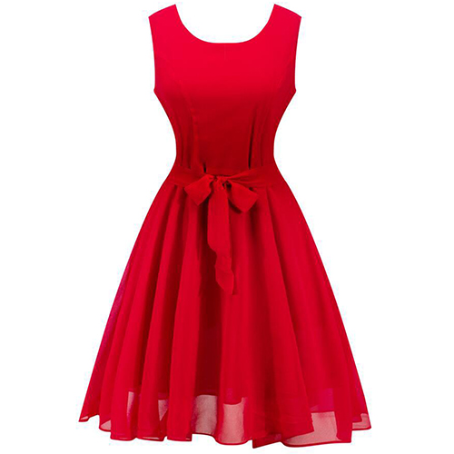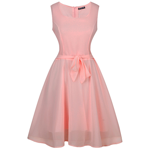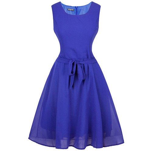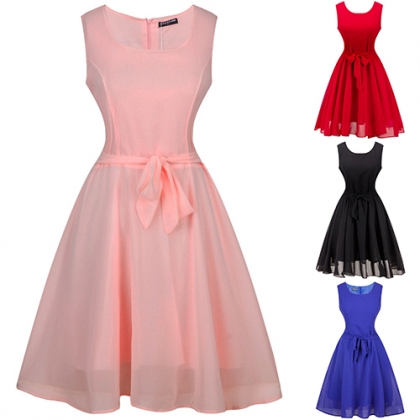 dress. This chiffon dress features a solid color,with sleeveless,round neck and lace-up