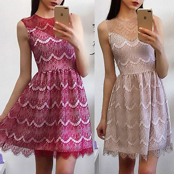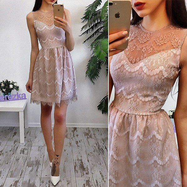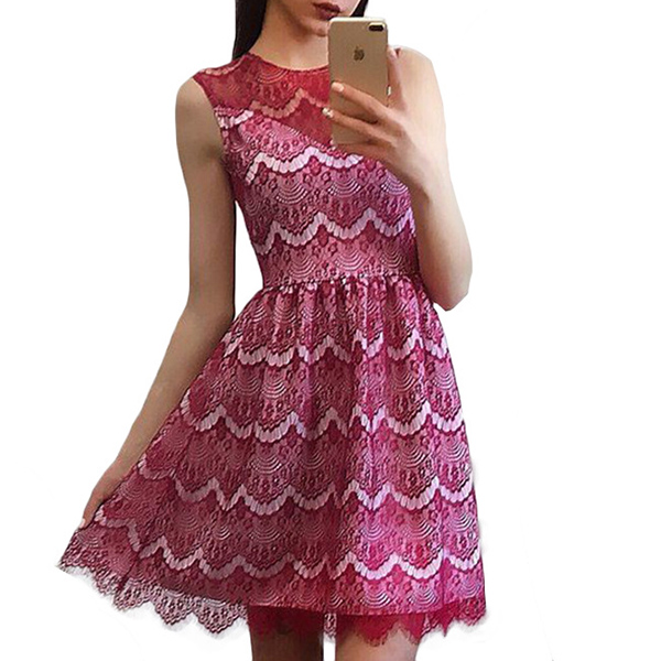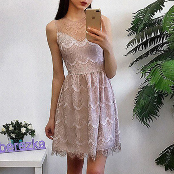 This lace dress is styled with sleeveless,round neck and a clean silhouette,delicate and elegant.