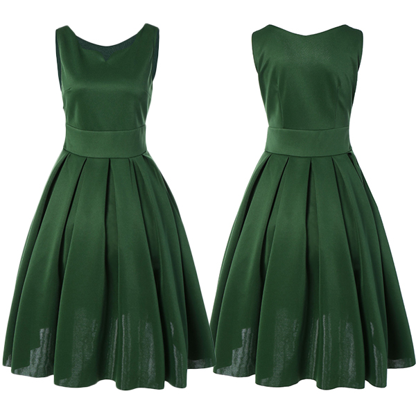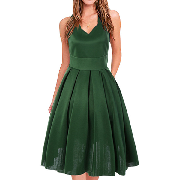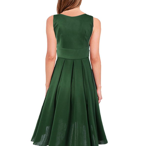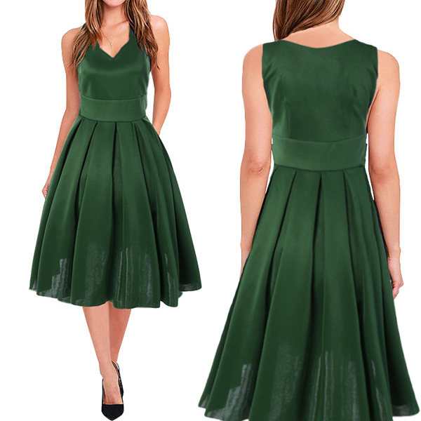 elegant and noble green tone,designed with sleeveless,v-neck,high waist and pleated hem,this dress can portray you