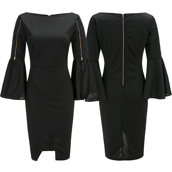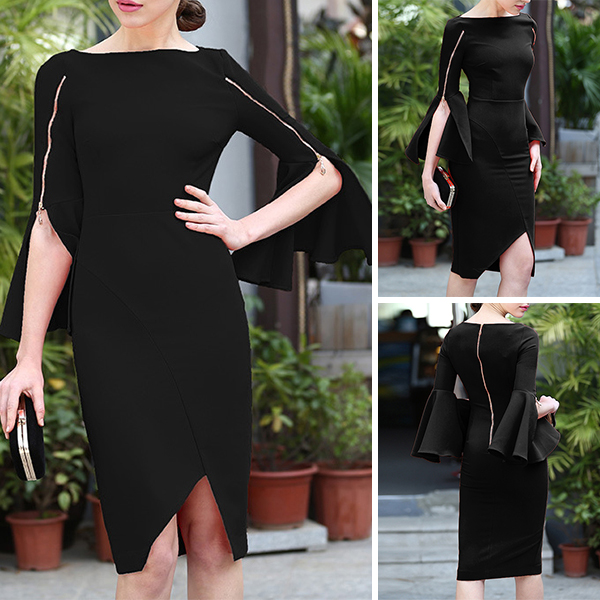 classic yet mysterious black tone,designed with slit trumpet sleeve,round neck and a fit silhouette,this dress can