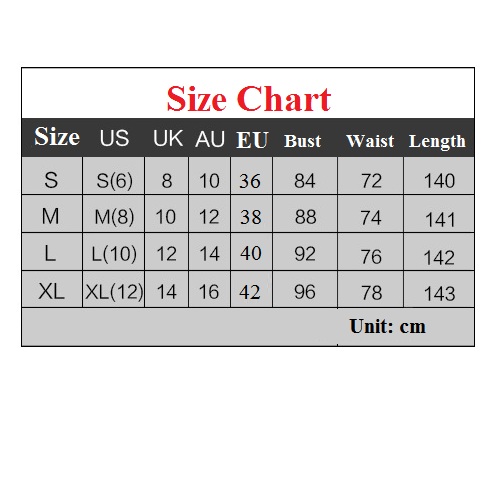 XL : Bust : 96cm(37.8"); Waist : 78cm(30.71"); Length : 143cm(56.3");