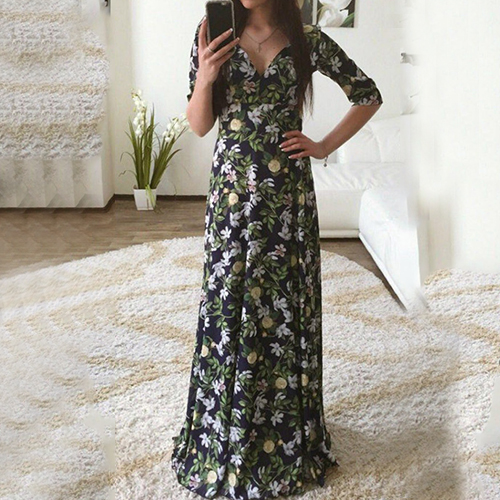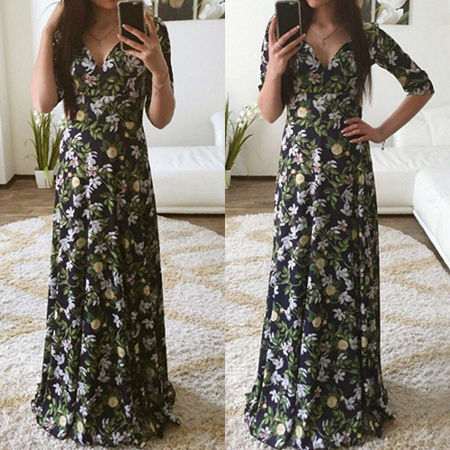 floral print, with v-neck, half sleeve and floor-length design, chic and graceful. With this dress, you are the most beautiful