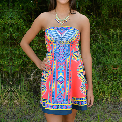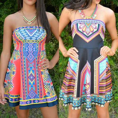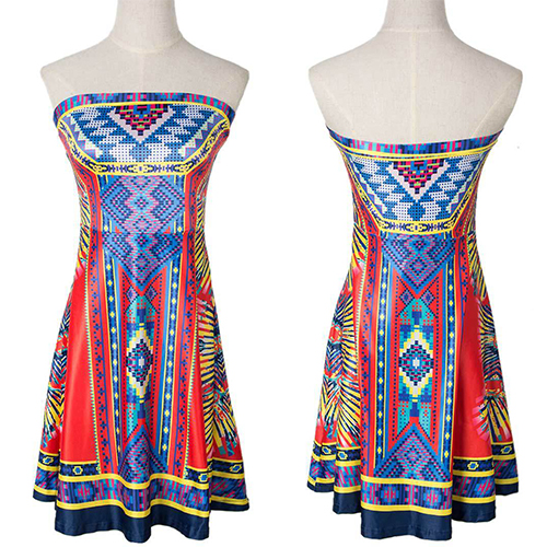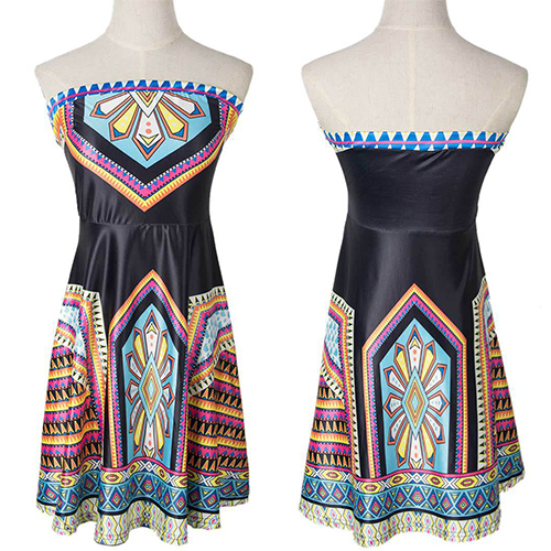 This dress features ethnic style printed pattern,with strapless and high waist design,sexy and charming.