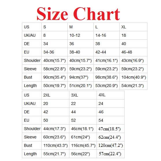 XXL (EU 48-50): Bust : 110cm(43.31"); Shoulder : 44cm(17.32"); Sleeve : 60cm(23.62"); Length : 55cm(21.65");
