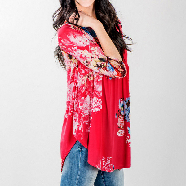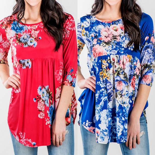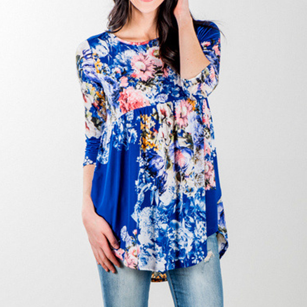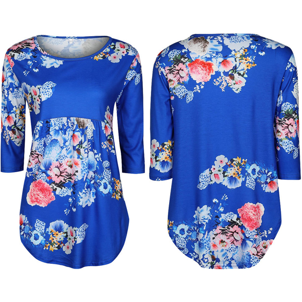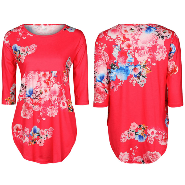 Show your love for floral print through this printed top! Boasts vibrant floral print,accompanied with 3/4 sleeve,round neck,