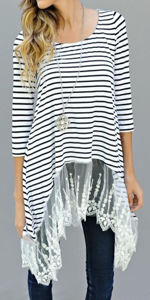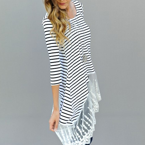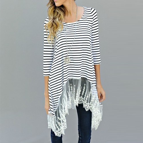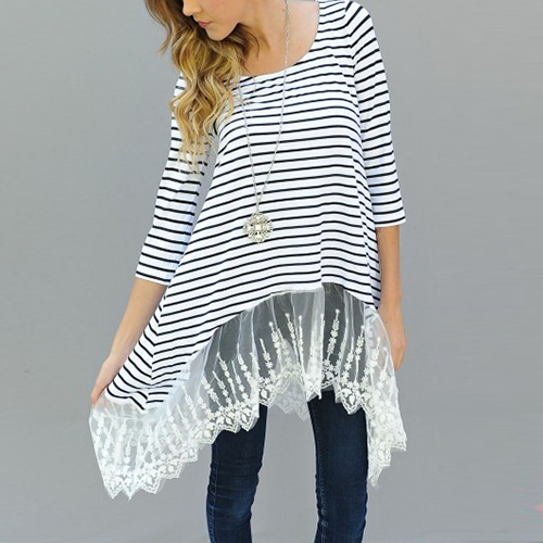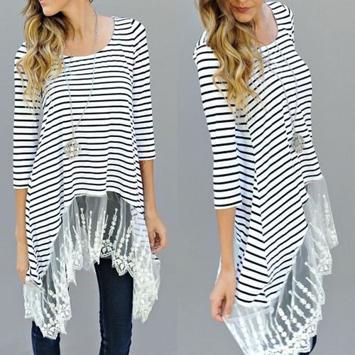 Such a chic and stylish t-shirt! Striped style,with 3/4 sleeve,round neck and irregular hem design.