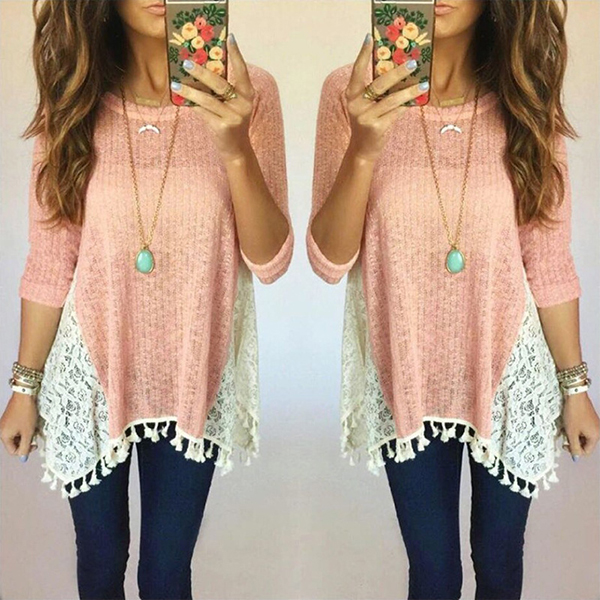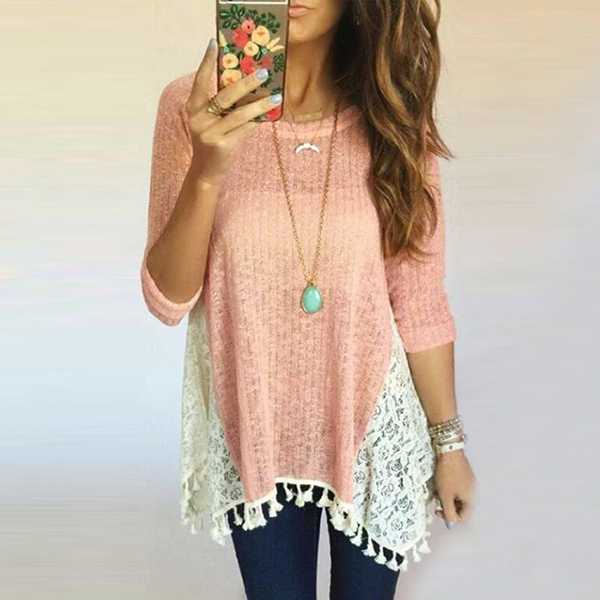 round neck,lace spliced hem and a loose silhouette,this little item definitely knows how to give you a cozy and