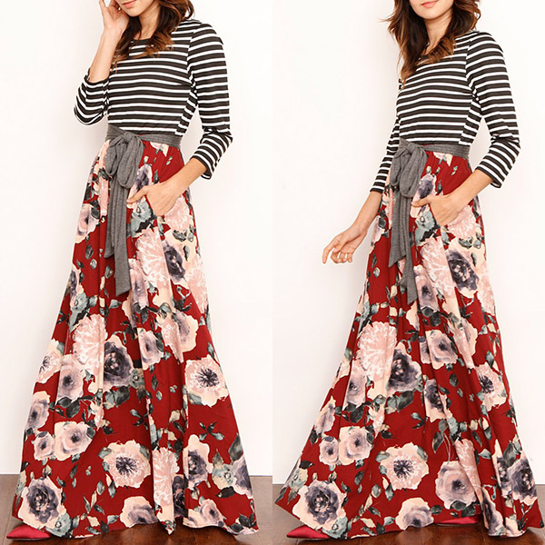 simple,cozy yet stylish. And the vibrant floral print spliced design is the highlight,which makes this dress look
