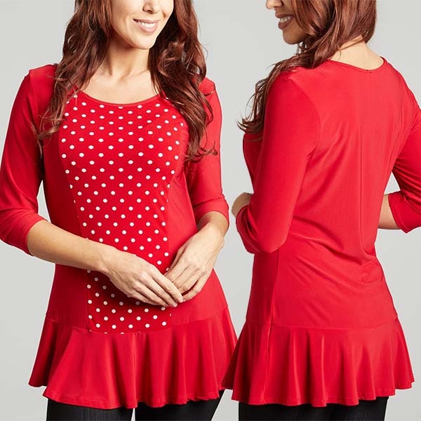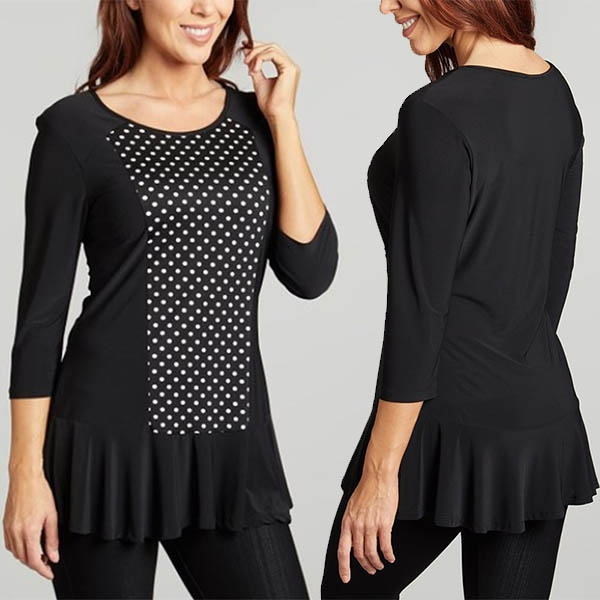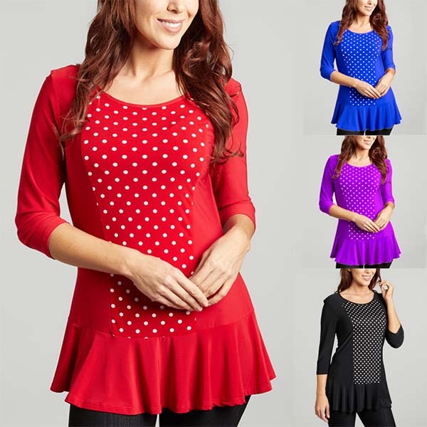 This t-shirt is finished with 3/4 sleeve,round neck and ruffle hem,chic yet stylish,while the dots printed