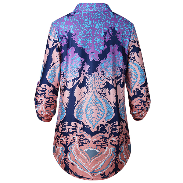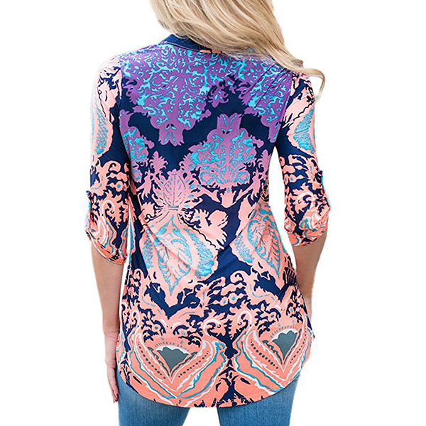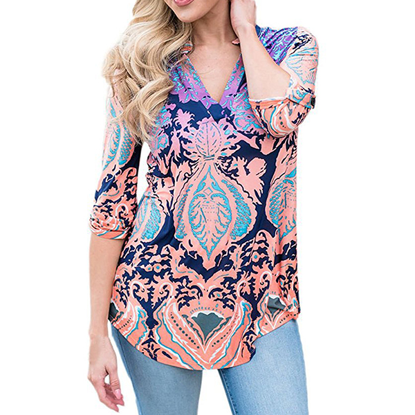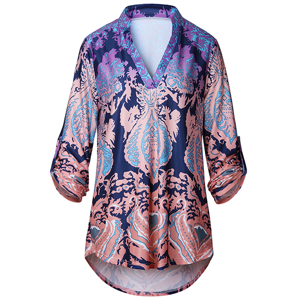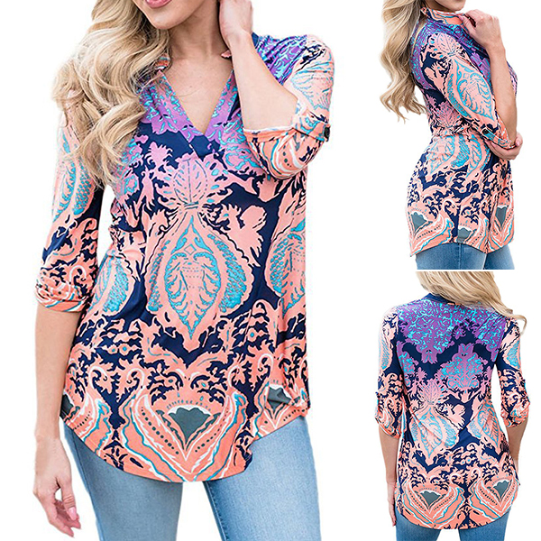 eye-catching printed pattern,designed with 3/4 sleeve,v-neck and a high-low hem,simple,delicate yet stylish.