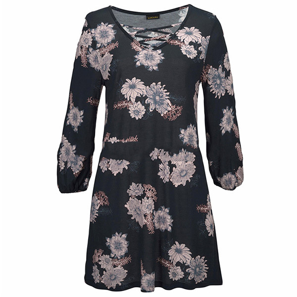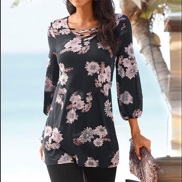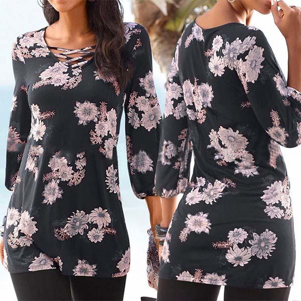 This t-shirt boasts chic and eye-catching printed pattern,finished with 3/4 sleeve and v-neck design,