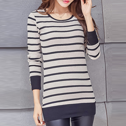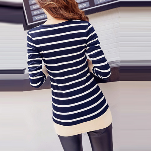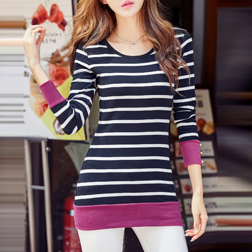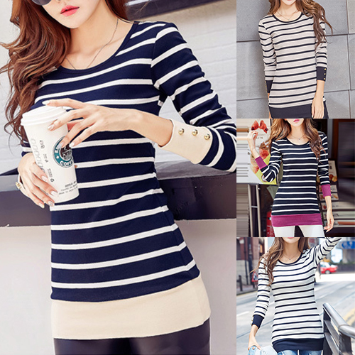 The tops is styled with contrast color and stripe patterns, with long sleeve and round neck design, which