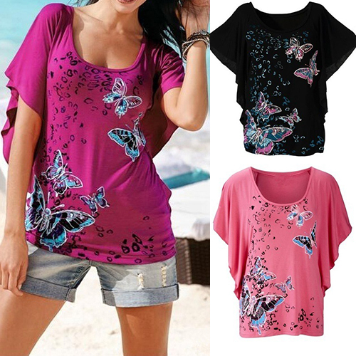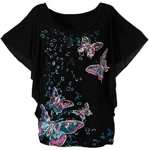 Fashion Butterfly Printed Dolman Sleeve Round Neck T-shirt