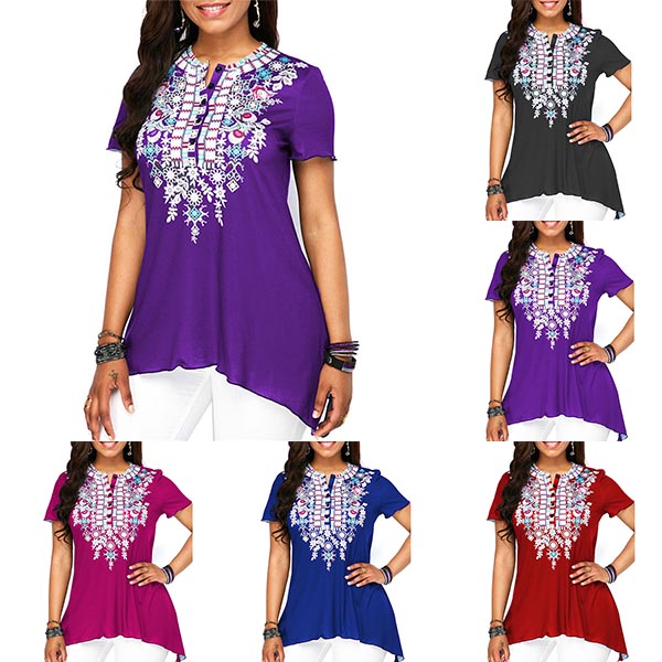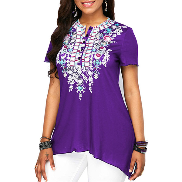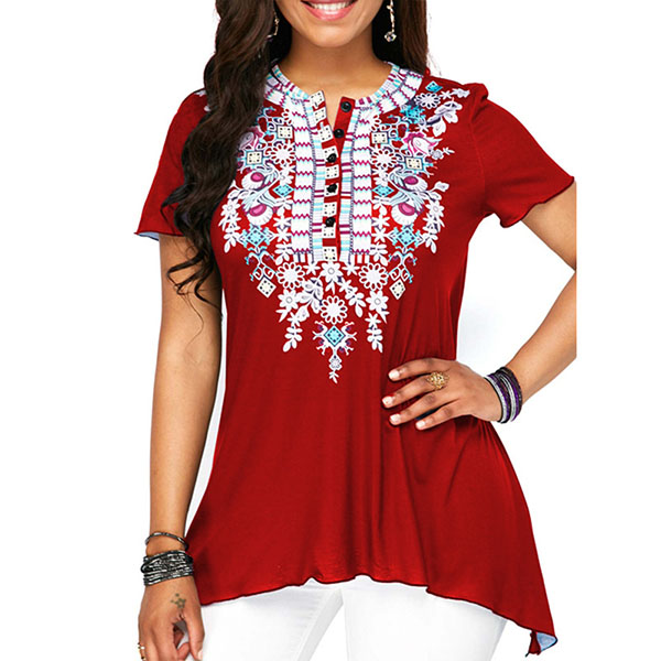 Floral grace this easy-going short sleeve T-shirt with button-front design! This short sleeve T-shirt features